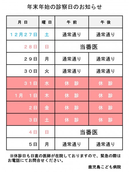 年末年始の休診は以下の通りとさせていただきます。